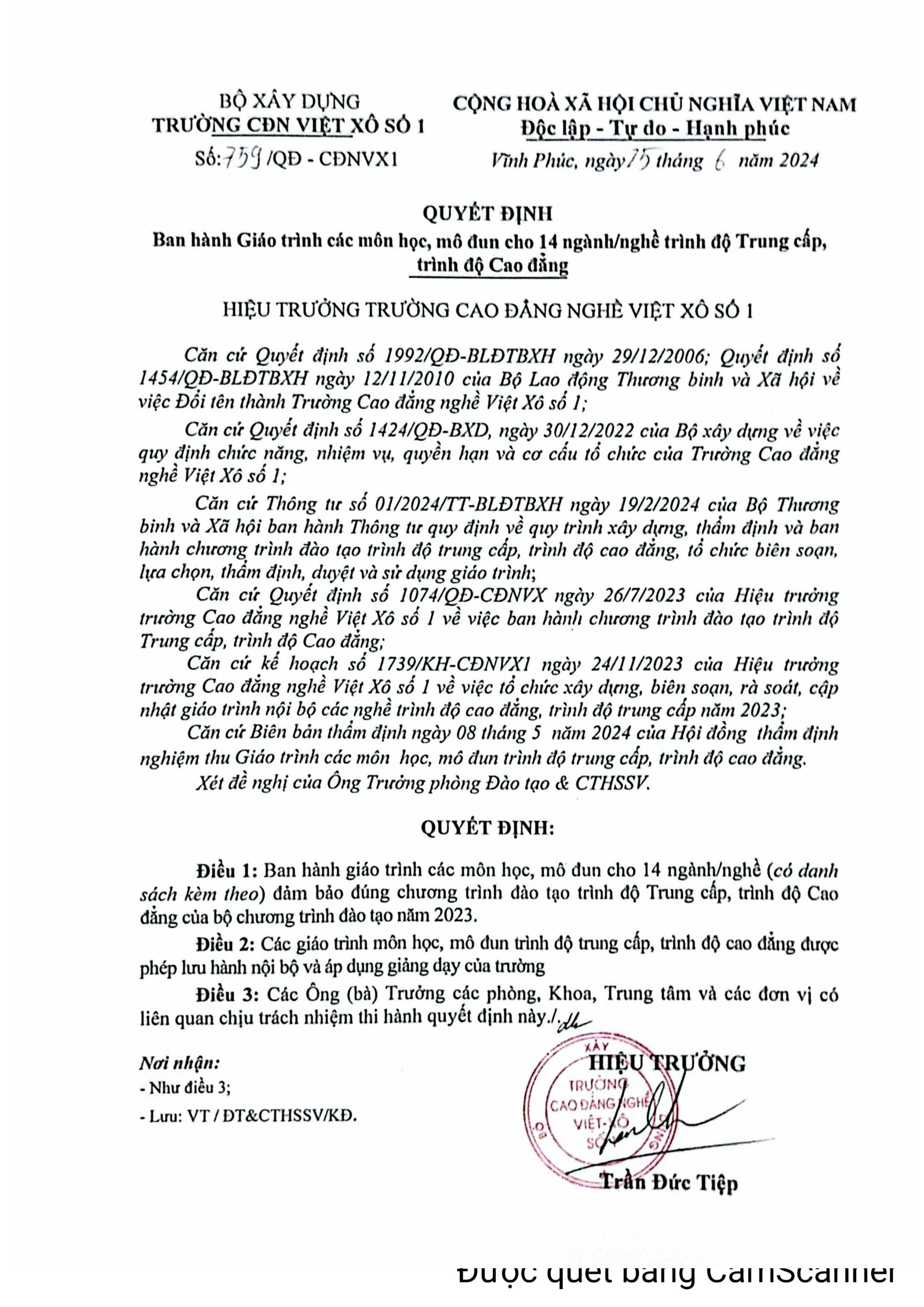 Quyết định ban hành giáo trình các môn học/mô đun cho 14 ngành/nghề trình độ Trung cấp, trình độ Cao đẳng