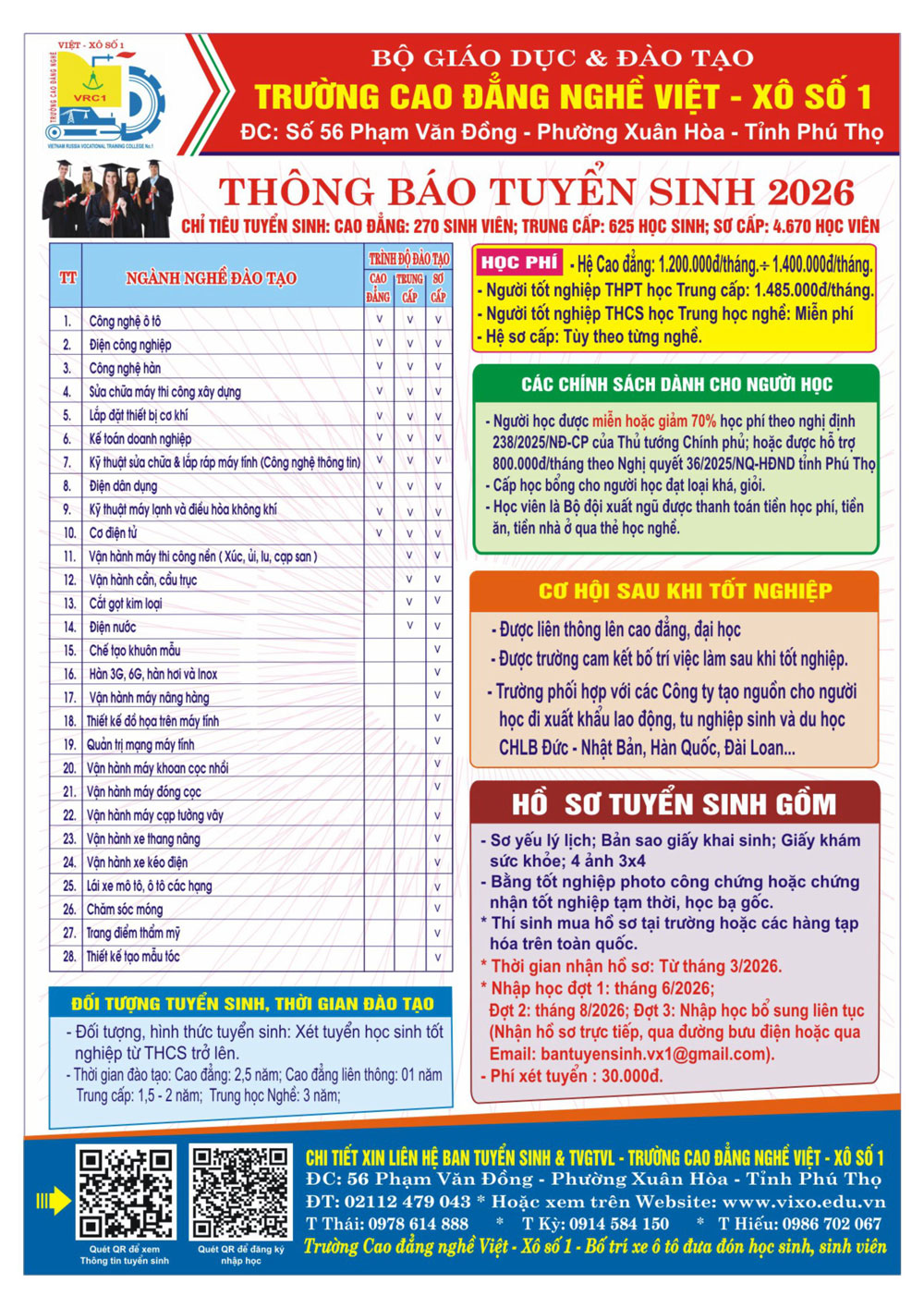 Thông tin tuyển sinh chung Trường cao đẳng nghề Việt – Xô số 1